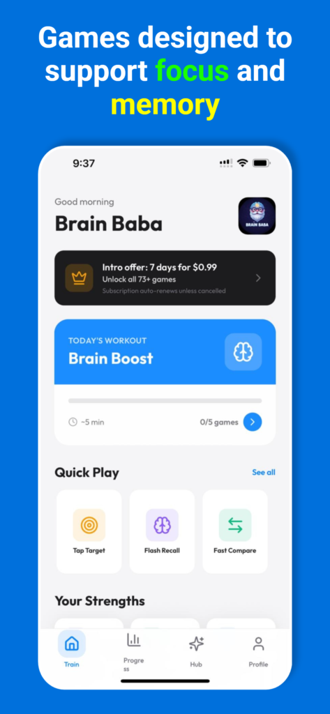 Brain Baba is a simple brain training and mindfulness app designed to help you build better focus, memory, and mental clarity through daily routines.