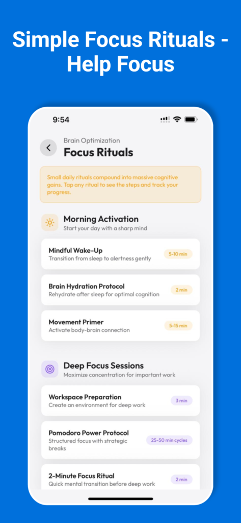 2. •Focus Rituals (POPULAR badge) – Daily habit checklists for Morning Activation, Deep Focus, Brain Breaks, Digital Hygiene, Evening Wind-Down