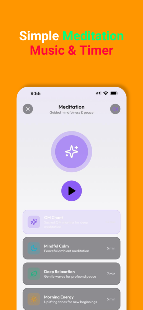 3. •Meditation (NEW badge) – 5 meditation tracks including OM chant and mindfulness practices with peaceful orb animation